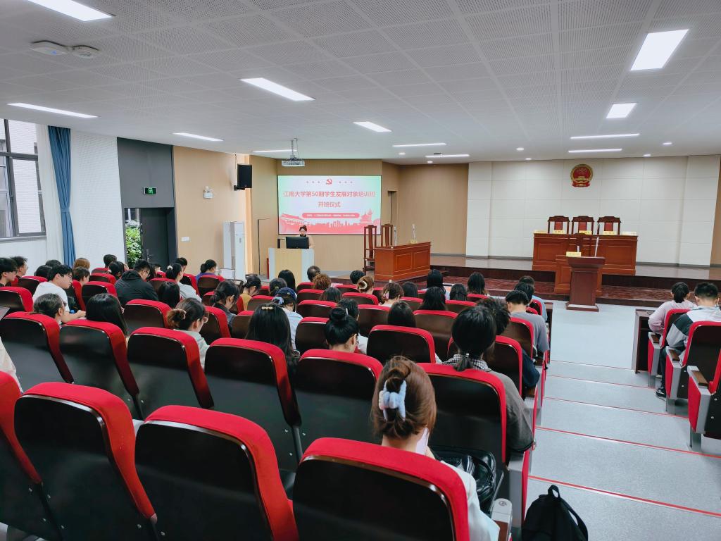 为全面贯彻落实党的二十大精神,进一步规范党员发展流程,提升发展对象党性修养,10月18日上午,由江南大学党委组织部、党校主办,法学院党委承办的江南大学联合分党校第50期学生发展对象培训班在模拟法庭正式开班。来自人工智能与计算机学院、外国语学院、法学院、马克思主义学院的71名发展对象参加培训。马克思主义学院思想政治教育系副主任、副教授彭长华出席开班仪式,会议由法学院党建辅导员缪晶晶主持。