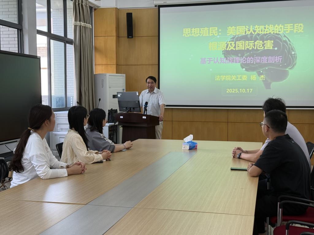 为帮助青年党员深入认识当前意识形态领域的复杂斗争,筑牢思想防、坚定理想信念、深化政治修养,10月17日下午,法学院关工委常务副主任杨杰老师为法学院本科生第五党支部全体同学带来《思想殖民:美国认知战的手段根源及国际危害》主题党课。