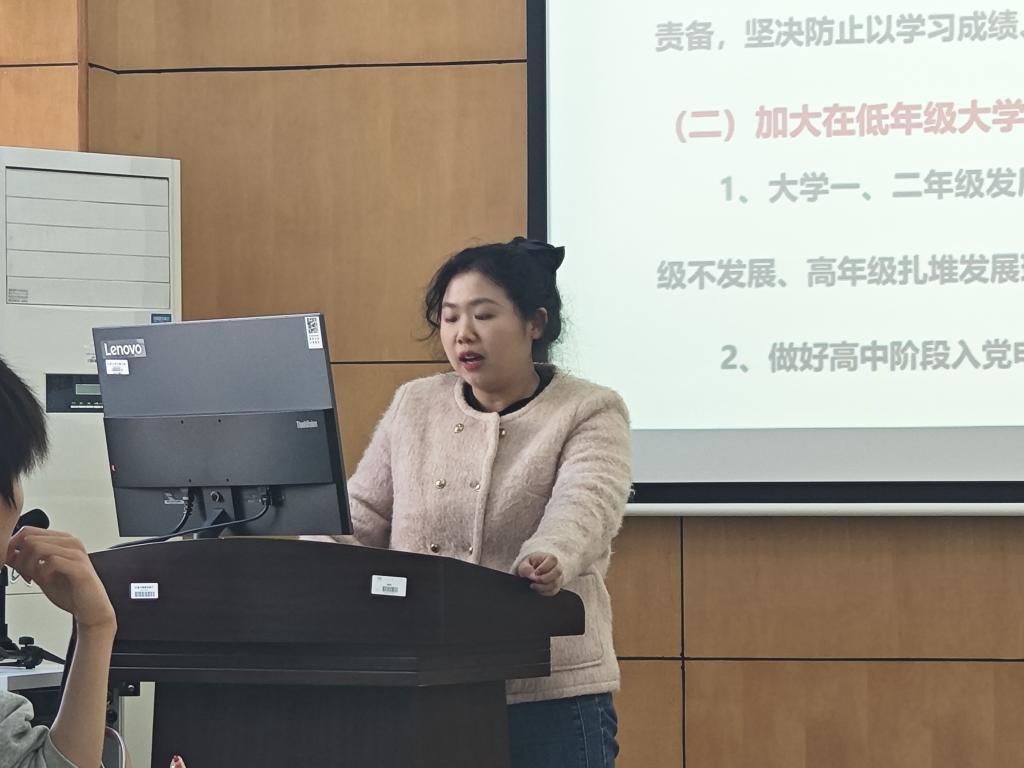专职组织员陆芳老师从党支部工作规范、支部工作手册填写注意事项和党支部换届选举工作程序等方面展开专题培训。以《中国共产党支部工作条例(试行)》为依据,她详细讲解党支部的工作规范,并针对“三会一课”的具体内容和要求进行解读。陆芳强调支部工作手册作为党支部工作的重要资料档案,是党支部组织活动开展的真实记录;要记录规范、完整,并根据日常工作和专项检查中发现共性问题,同时强调党支部换届选举的程序性与规范性。党建辅导员缪晶晶老师从支部建设基本规范、发展党员程序及注意事项、智慧党建系统操作要求、高校党日活动策划与组织和高校学生党支部书记素养五个部分入手,以《中国共产党发展党员工作实施细则》等文件为依据,由浅入深带领同学们明确党员发展的具体流程和注意事项,就如何组织和策划党日活动提出七点建议,总结高校学生党支部书记应具备的五大基本素养,并强调党员坚持要把政治标准放在首位,并寄语“磨练顶天立地的思维、积累日复一日的努力、追求突破卓越的成长”。