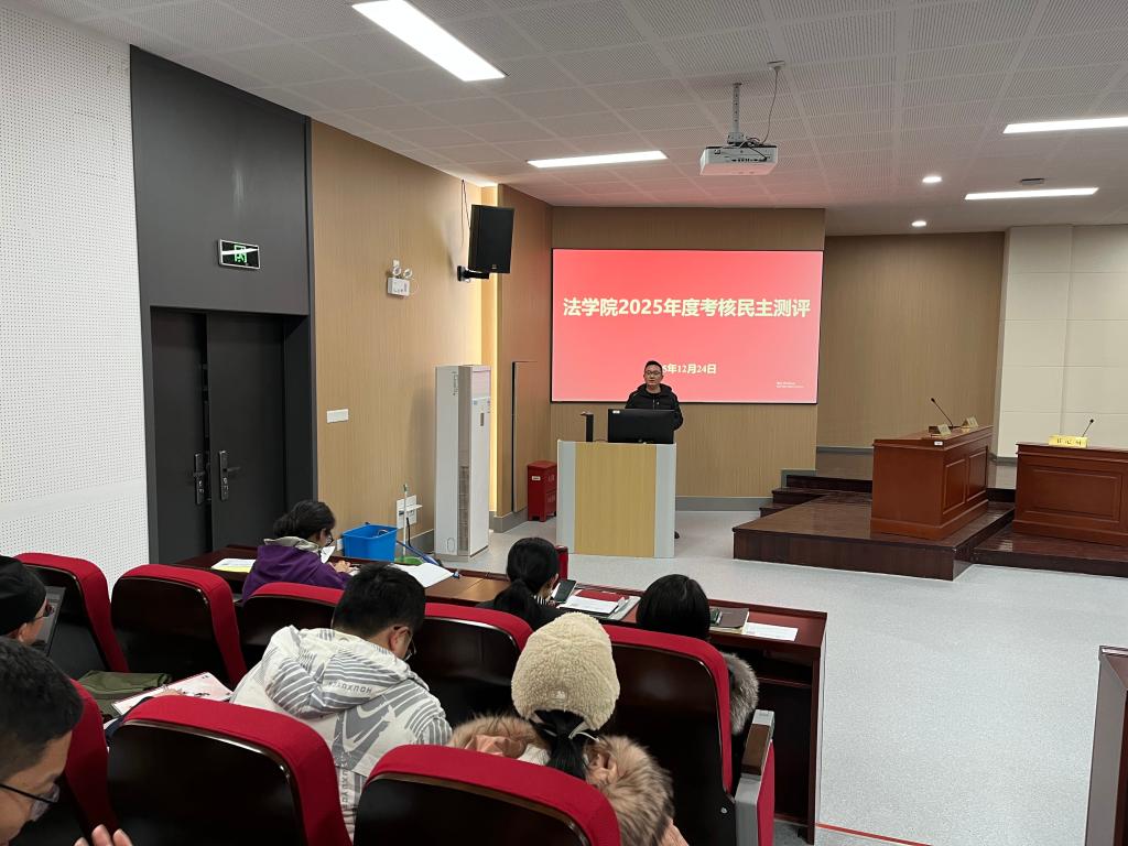 12月24日下午,法学院在模拟法庭召开全院教职工大会,进行中层领导干部述职述廉及民主测评,院领导班子及全院教职工参加会议。会议由法学院党委书记陆秦主持。