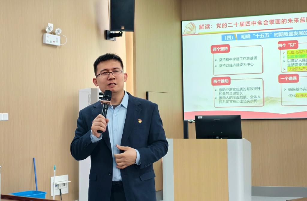 会上,江南大学马克思主义学院副教授、硕士生导师巩建青老师作《擘画新蓝图奋进新征程——学习贯彻党的二十届四中全会精神》专题宣讲。他紧扣五大核心维度层层递进、逐步深入:其一是解读党的二十届四中全会的核心内涵,具有锚定“十五五”、奠基“现代化”的战略意义。其二是剖析党中央高度重视“十五五”规划编制的核心逻辑与战略考量。其三是回顾“十四五”时期,我国在经济社会发展、科技创新、民生保障等领域取得的历史性成就与突破性进展。其四是讲解党的二十届四中全会生动擘画的未来蓝图,认识到社会主义现代化是一个阶梯式递进、不断发展进步的历史过程,需要全社会人民不懈努力、接续奋斗。最后是对贯彻落实党的二十届四中全会精神的实践路径进行生动阐释,进一步夯实教职工立足岗位、干事创业的责任与担当。