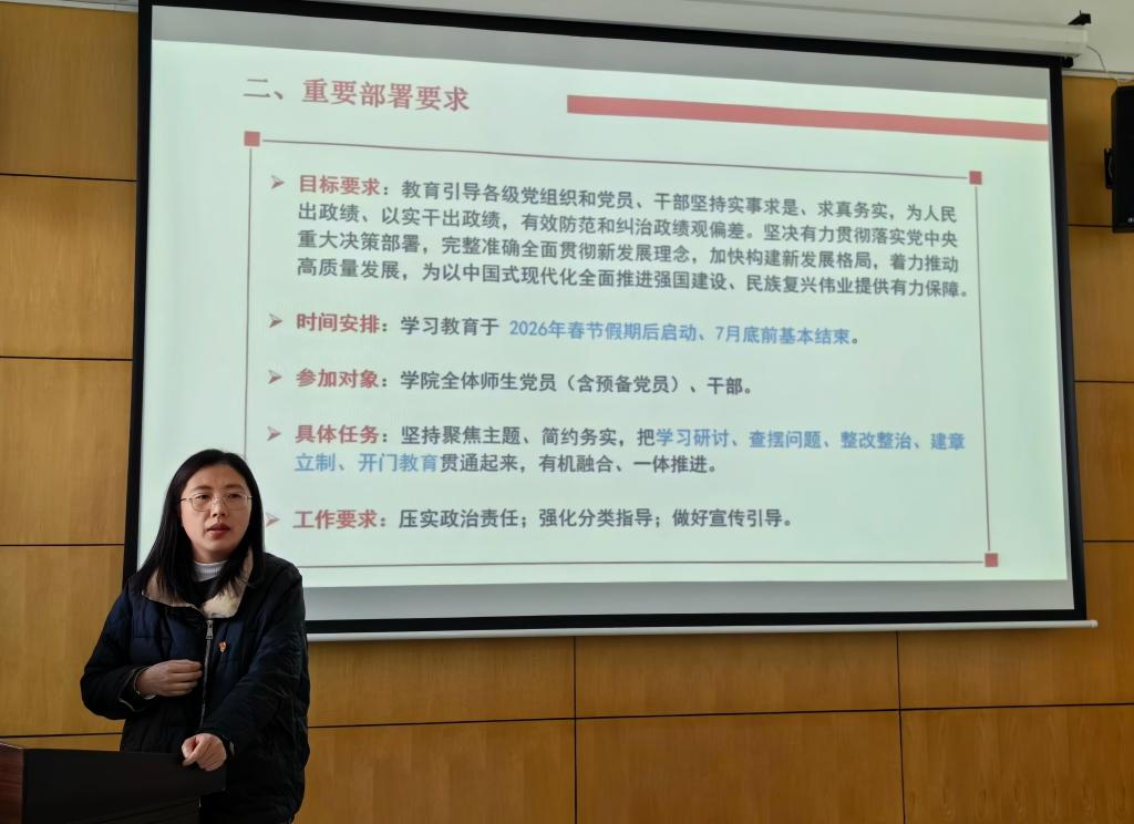 党委书记陆秦首先传达了上级党委关于开展树立和践行正确政绩观学习教育的部署要求。他强调各党支部和全体党员要切实提高政治站位,深刻把握学习教育核心内涵,坚决把思想和行动统一到上级决策部署和学院党委工作要求上来,把开展学习教育作为当前一项重要政治任务。要坚持问题导向,准确把握正确政绩观的实践要求,强化责任担当、砥砺知行合一,推动学习教育活动走深走实。要坚持开门教育,扎实完成好学习研讨、查摆问题、整改整治和建章立制等各项工作安排,为“十五五”开局之年提供坚实保证。专职组织员陆芳就《法学院党委开展树立和践行正确政绩观学习教育实施方案》进行了细化解读,明确相关工作的具体举措、核心内容和时间计划。同时针对2025年度基层党支部组织生活会与民主评议党员工作进行了培训与布置,细化分解组织生活会会前、会中、会后各阶段工作的责任和内容,对相关注意事项进行了重点提醒。